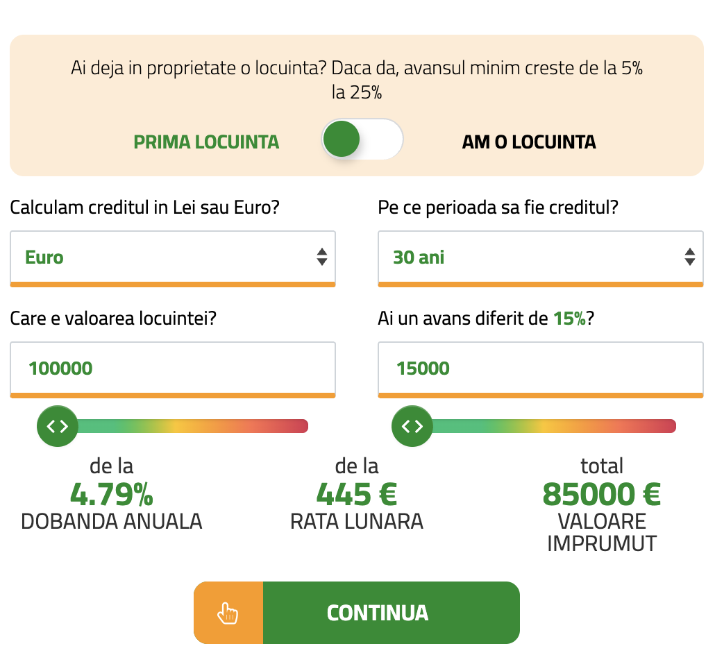 Dacă vrei să îți achiziționezi prima ta proprietate cu credit imobiliar, la un preț de 496.950 lei (100.000 Euro), avansul minim va fi de 74.544 lei (15.000 Euro), valoarea creditului fiind de 422.406 lei (85.000 Euro), care pe 30 de ani va avea rata lunară începând de la 2503 lei, o rată a dobânzii începând de la 5.89%/an, un comision de analiză 400 Lei, DAE începând de la 6.06%, și o valoare totală plătibilă la finalul contractului de credit începând de la 977.178 lei.